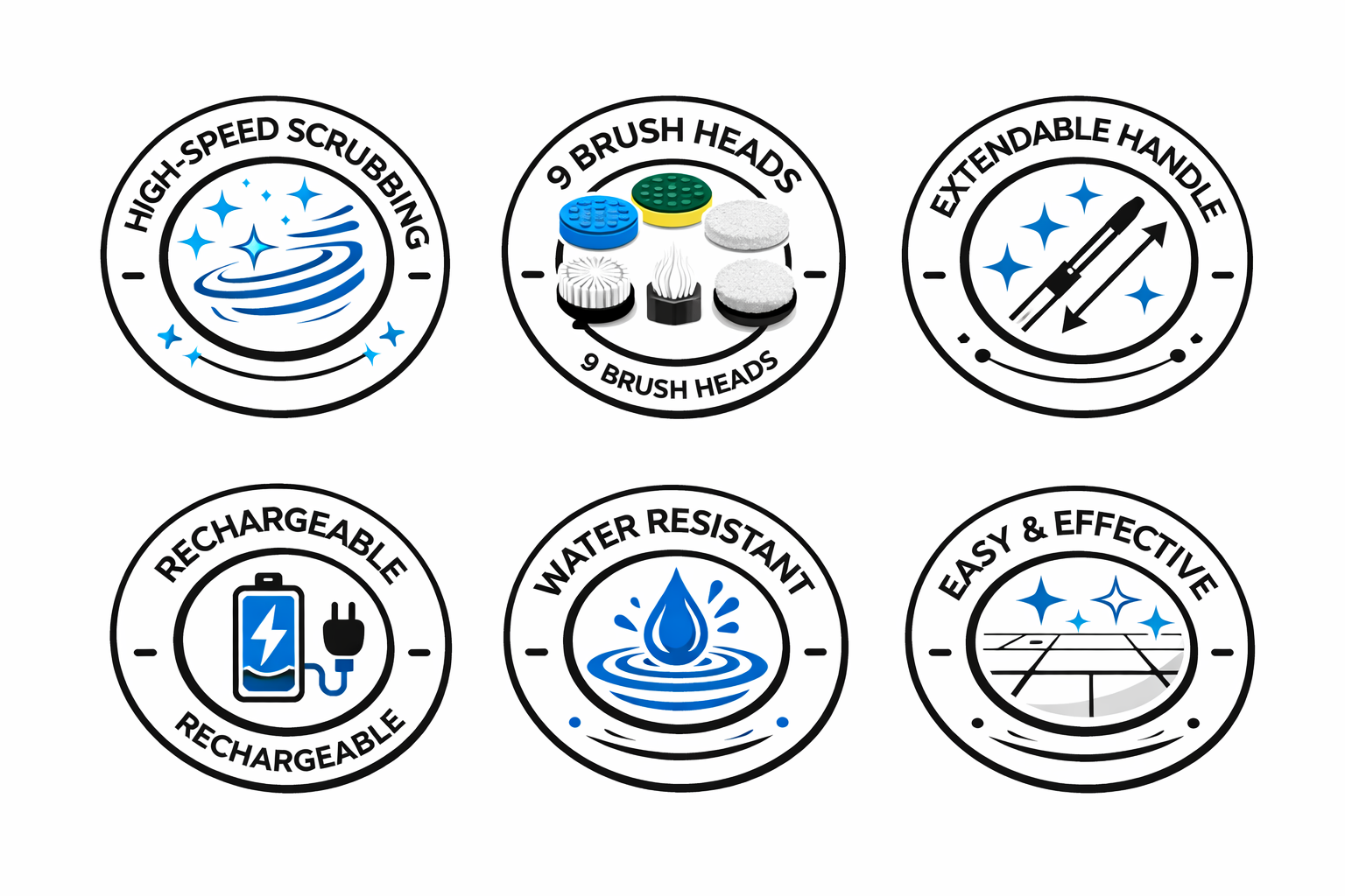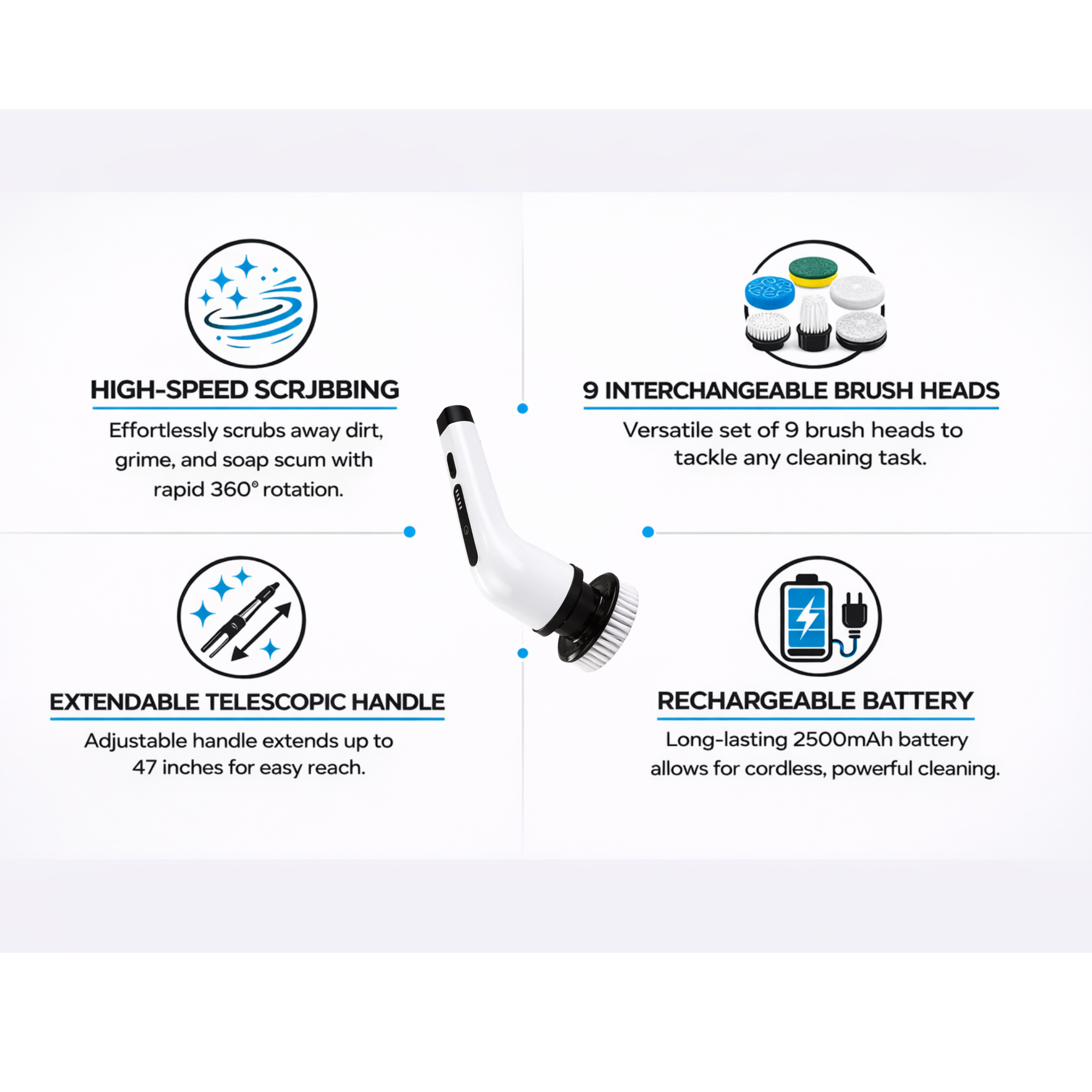 ✔ 9 Interchangeable Brush Heads – Designed for grout, tile, sinks, floors, corners, and more